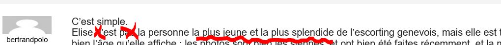 Elise n’est pas la personne la plus jeune et la plus splendide de l’escorting genevois, mais elle est tout de même très bien, et elle a bien l’âge qu’elle affiche ; les photos sont bien les siennes, et ont bien été faites récemment, et la montrent bien telle qu’elle est. Elise, elle a de a personnalité, elle est funny ;elle assume bien ce qu’elle fait ; et elle fait bien les choses pour que l’on se sente bien, bien accueilli, bien douché, bien etc, bien embrassé, bien sucé (jusqu’au bout, cim possible), bien baisé, on sort de chez elle bien essoré bien détendu et bien disposé.Et donc on dit du bien d’elle, et on se dit qu’on y retournerait bien, ou qu’on passerait bien plusieurs heures avec elle.
