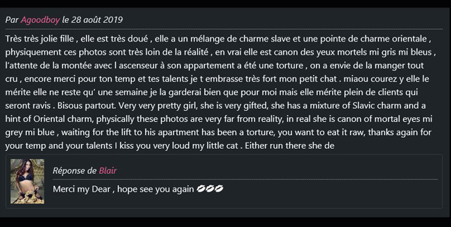 Les moins: elle reçoit dans un hotel en face de Manor, pas super discret avec la réception et c’est plus un 2* qu’un 4-5*, ses seins ne sont pas fermes, on dirait qu’elle avait des implents mais enlevé maintenant (trop de peaux vers les mamelons), ils sont pas moches non plus mais c’est clairement son points faibles côté physique (pas pour rien qu’elle ne mets pas de photos de sa poitrine. FK très timide voir inexistant.