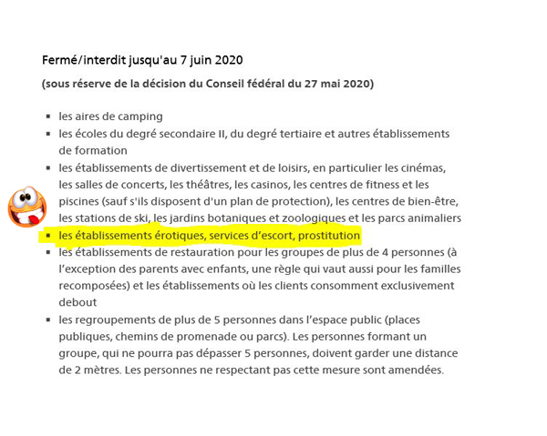 Hello mes amis Suisses. Comme les frontières avec la France sont toujours fermées jusqu’au 15 juin, qui veut me faire un ordre de mission pour que je profite des filles avant le 15 ?